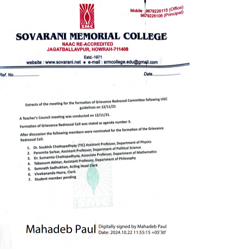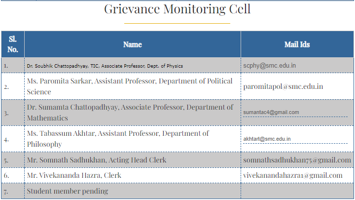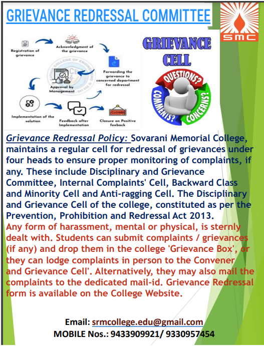 The Grievance Redressal Cell has been developed to settle the grievances of the students and other stakeholders within a reasonable time period for further strengthening the bond of the students with the institution by providing them with all kind of facilities to a satisfaction level for maintaining a convenient ambience of academic teaching and learning.