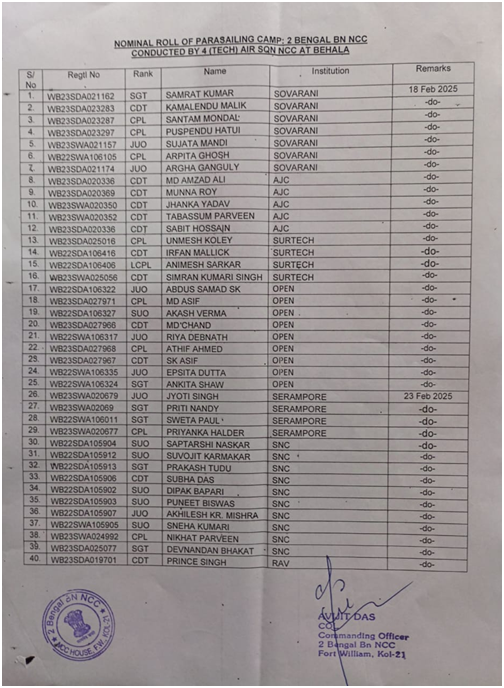 Five days Training on Parasailing camp conducted by 4(Tech) Air SQN NCC at Behala from 18th to 23rd February 2025