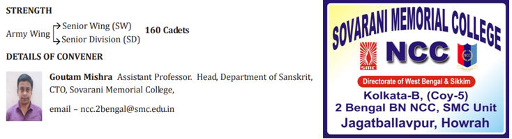 NCC unit is the part of social voluntary service in the largest Army Section under Ministry of Defence Govt. of India. Being inspired with the principle “Selfless service is the highest religion” and to establish this among the human society NCC unit of Sovarani Memorial college was established in 2003 under Fort William, Kolkata.