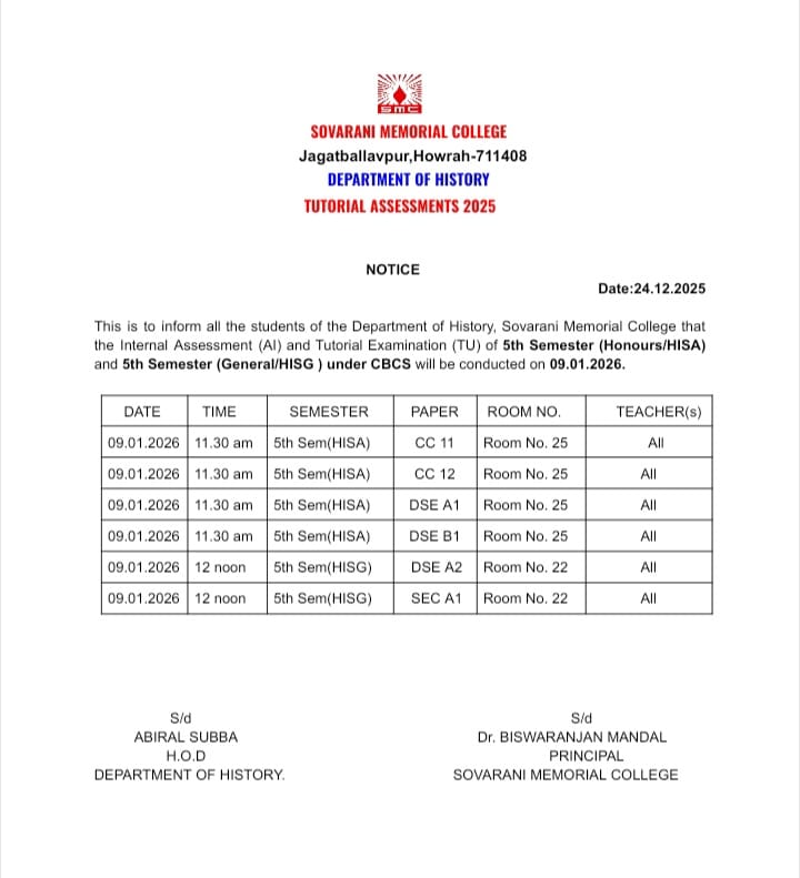 Title: Dept of History - Schedule of Internal and Tutorial Exams for 5th Semester (CBCS)
