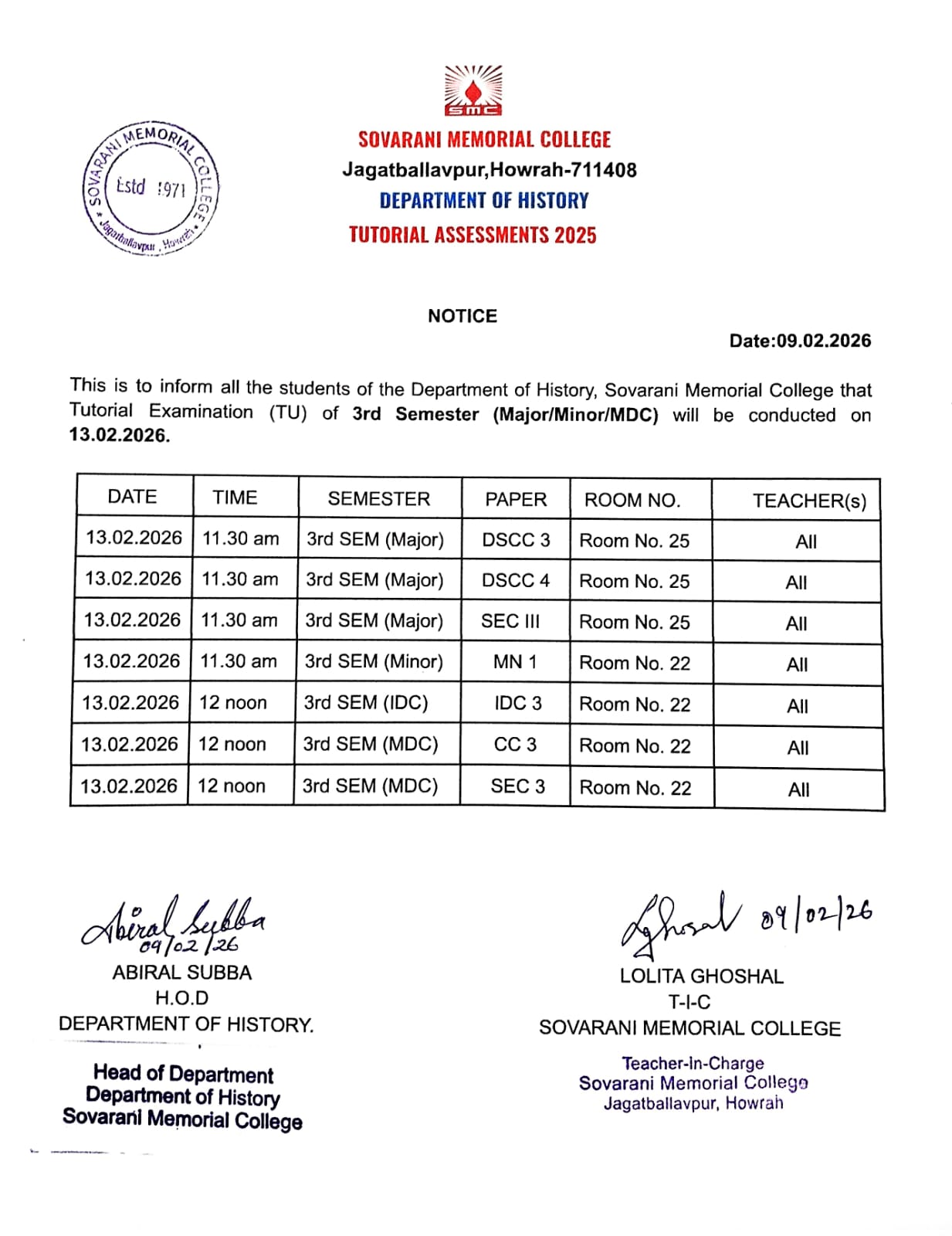 Title: Department of History: Notice for Tutorial Examination of 3rd Semester (Major/Minor/MDC)
